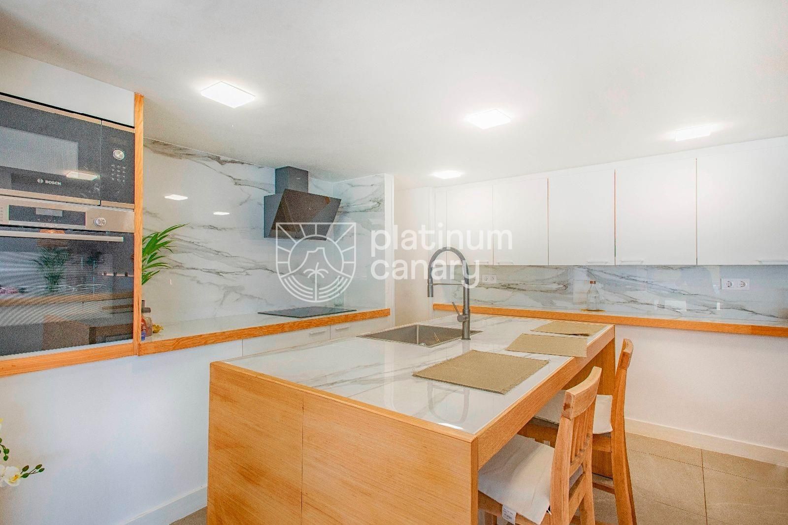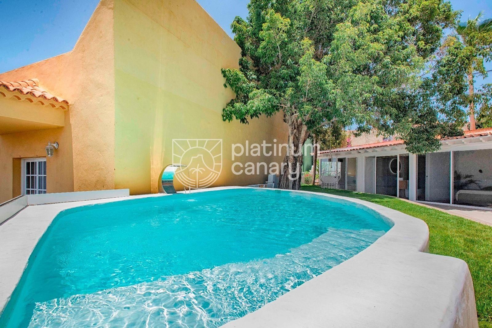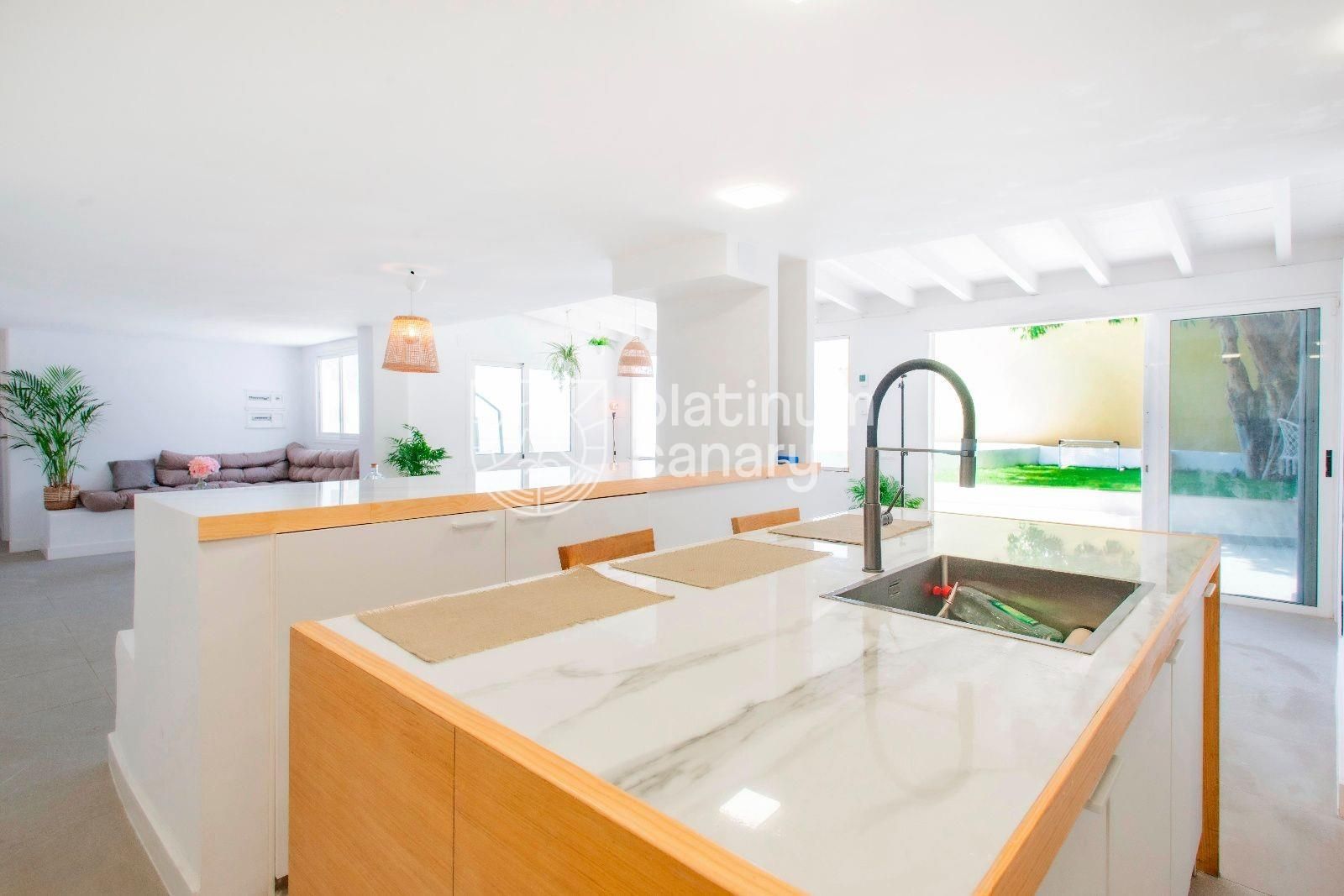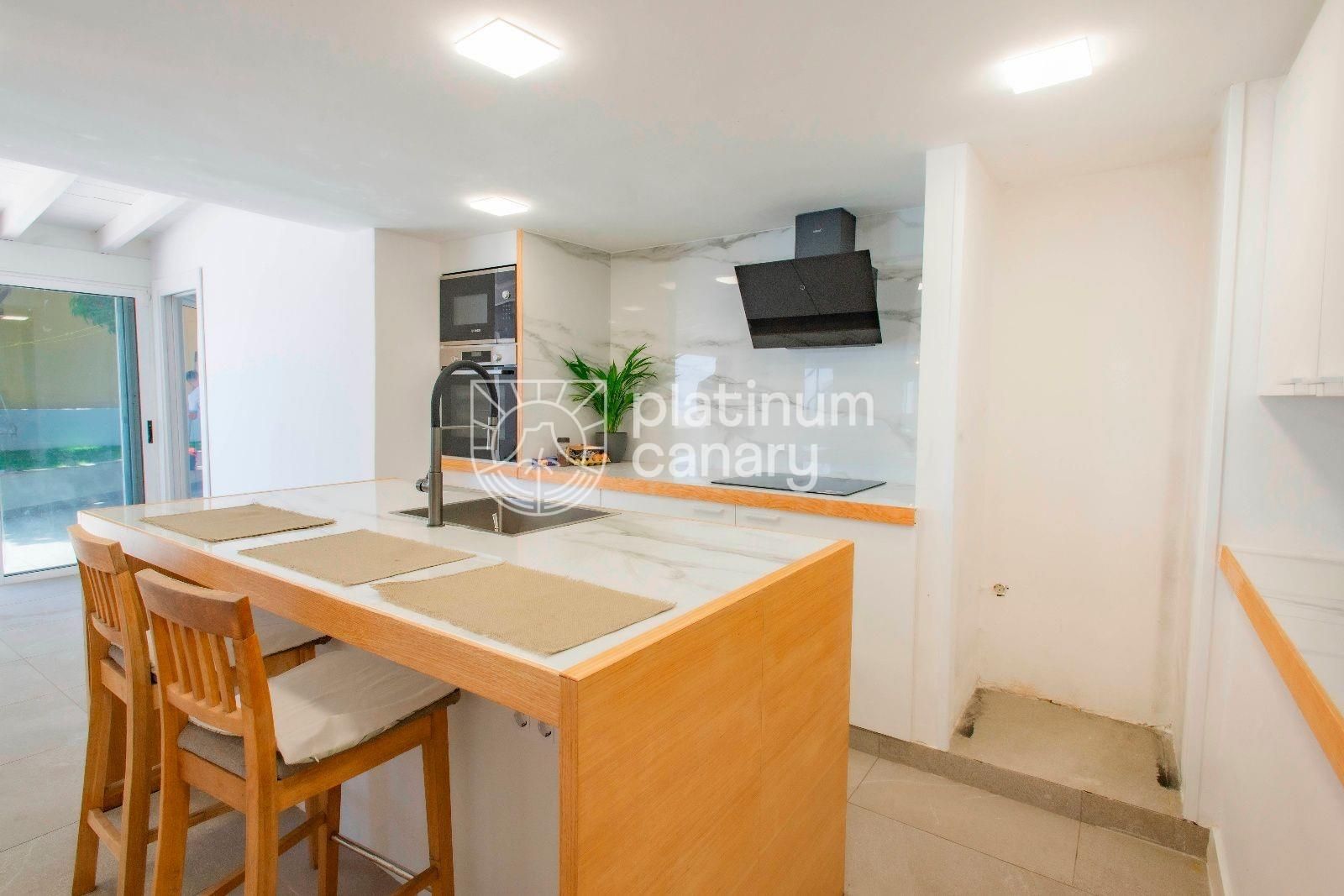 Renovado, Casa amplia y luminosa en edificio adosado. En una sola planta con cuatro dormitorios, todos en-suite. Dormitorio principal con vestidor y aseo independiente. Cocina abierta con isla y barra, luminoso salón comedor de dos ambientes y acceso directo al jardín con albercaDos dormitorios tienen acceso independiente al jardín. El jardín cuenta con césped, un árbol maduro con sombra, parterres, asientos en el interior Con una mesa grande y un bonito diseño. zona de natación. Vistas panorámicas al mar, privacidad y tranquilidad. Estacionamiento para 2 coches grandesAdecuado tanto para vivienda familiar/segunda residencia como para alquileres a corto plazo.