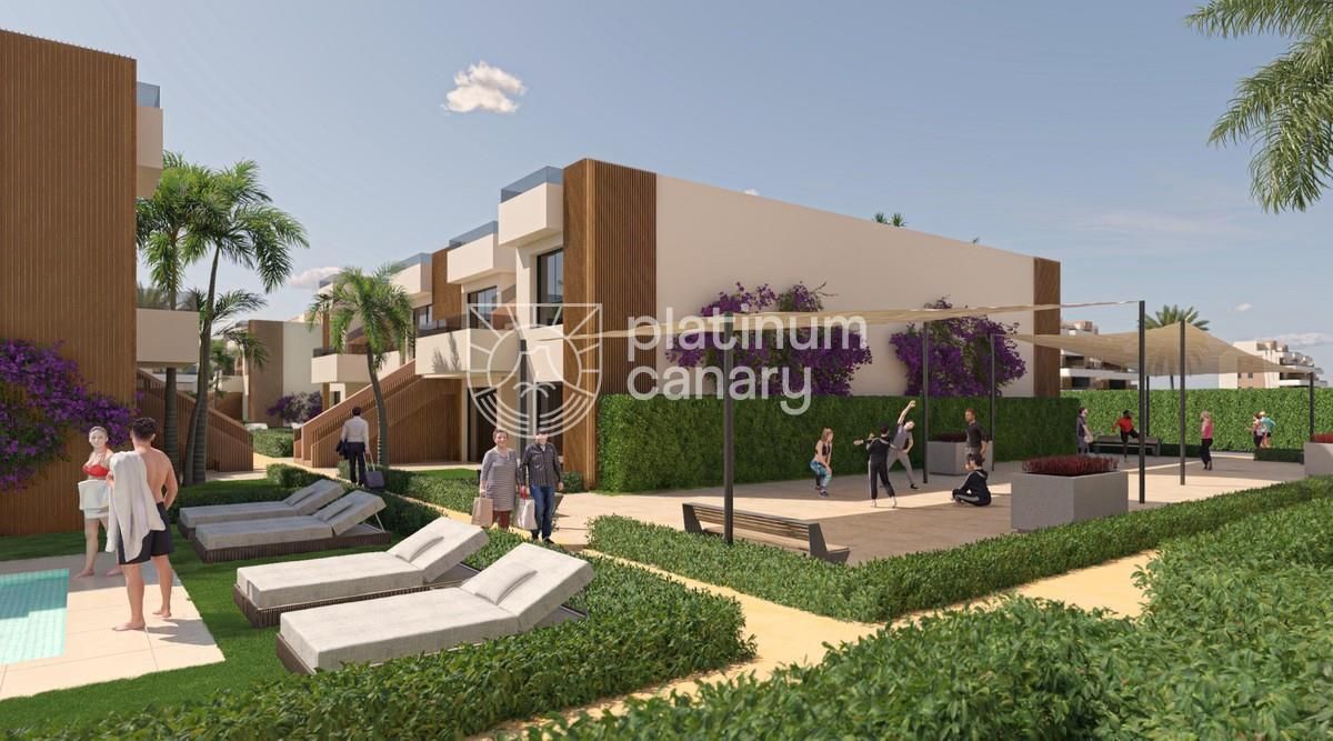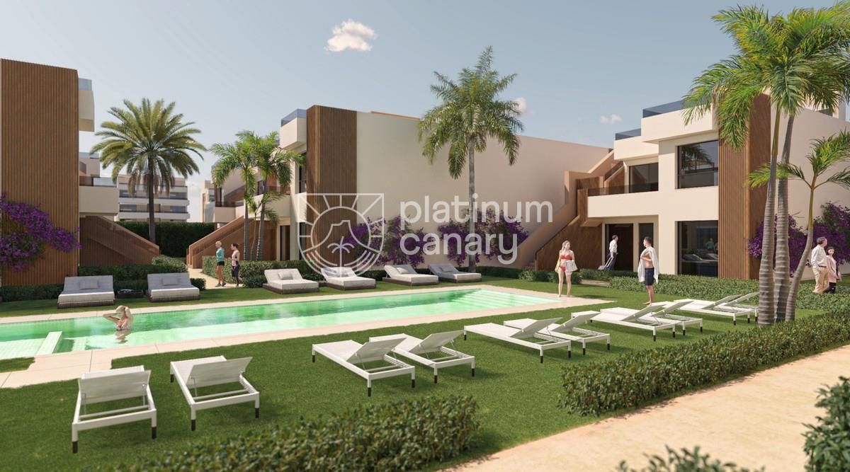 Planta superior: terraza delantera + gran solárium con vistas a golf y montaña.El complejo cuenta con jardines con plantación mediterránea/tropical y piscina con solárium.